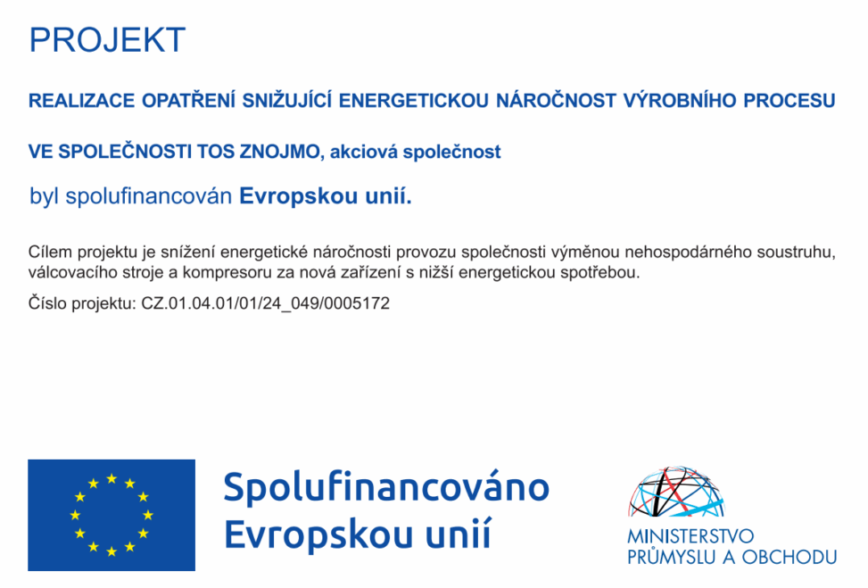 Společnost TOS ZNOJMO, a.s. realizuje v r. 2018-2019 projekt s názvem „TOS ZNOJMO, a.s. – účast na zahraničních veletrzích“, jehož předmětem je účast na veletrhu SPS IPC Drives v Německu v r. 2018 a 2019. Základním cílem projektu je rozšíření exportních aktivit společnosti a navázání nové dlouhodobé spolupráce se zahraničními partnery.